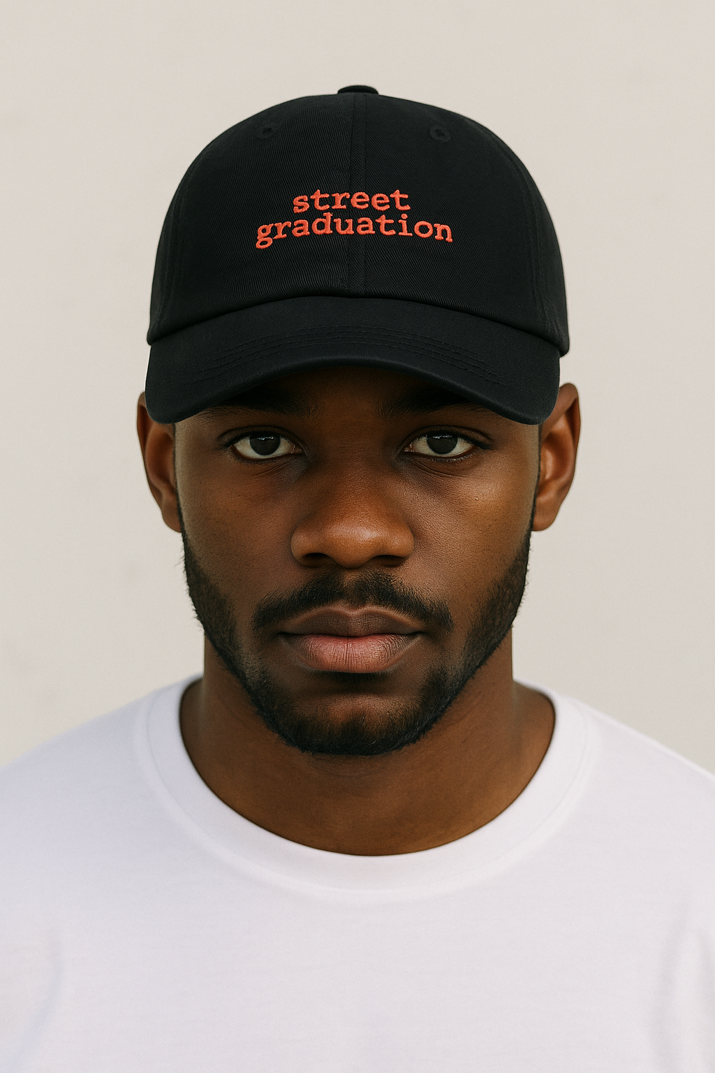 Die Street Graduation Cap in Schwarz trägt ihren Namen mit Stolz. Minimalistisch, kraftvoll und verstellbar – ein fester Bestandteil der ersten Ghetto University Kollektion.
